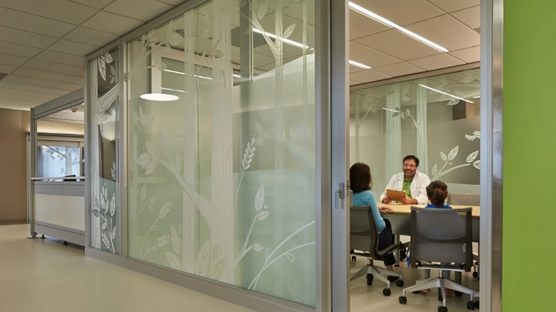 - شیشههای سندبلاستشده یا ماتشده با الگوهای دلخواه: برای حفظ حریم خصوصی در اتاق معاینه یا اتاق پزشک و در عین حال افزودن جلوه هنری.